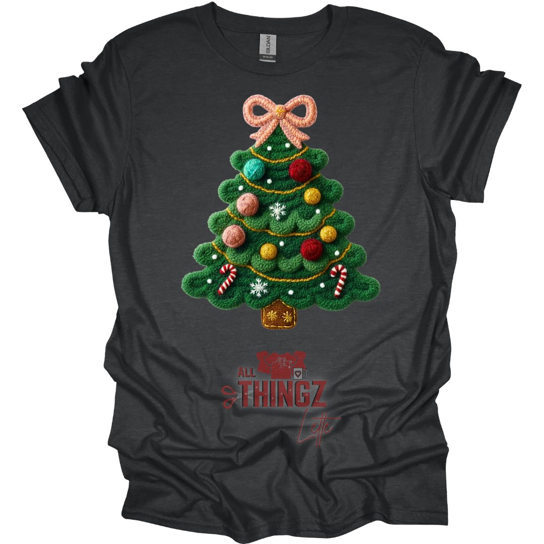 This isn't your grandma's crochet... or is it? This tee features an incredibly detailed graphic that looks exactly like a real crocheted Christmas tree, complete with yarn-ball ornaments, snowflakes, candy canes, and a sweet pink bow on top.