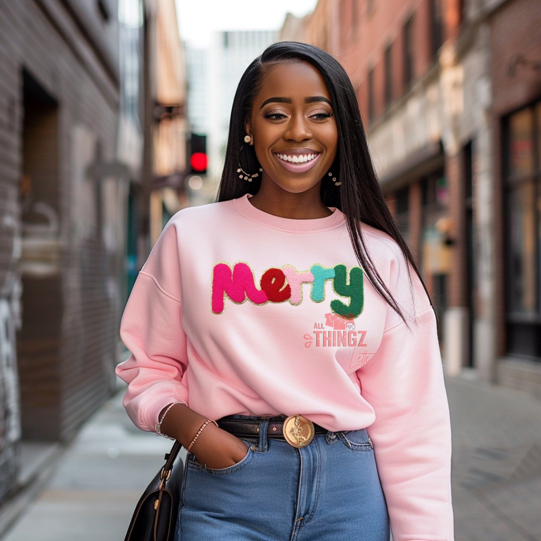 Playful and bright! This design features thick, bubble-letter font with a fuzzy "chenille" look in popping shades of hot pink, red, and forest green. It’s a fun, candy-colored twist on traditional Christmas wear.