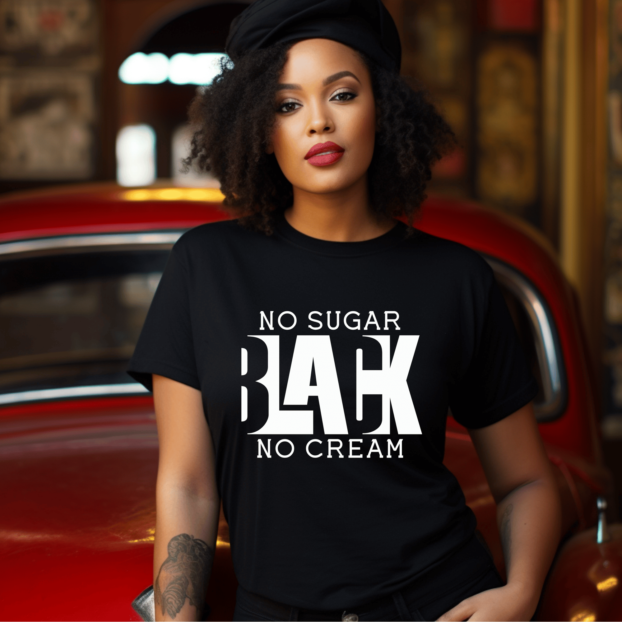 Make a powerful statement with our "No Sugar Black No Cream" t-shirt. This design is a bold and direct metaphor for being unapologetically yourself, embracing your Black identity with confidence and authenticity. The clean, minimalist text on a crisp white tee serves as a powerful declaration of self-love and pride, without compromise or embellishment. This shirt is a timeless piece for Black History Month, Juneteenth, or any day you want to wear your heritage with strength and style.