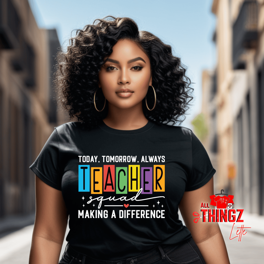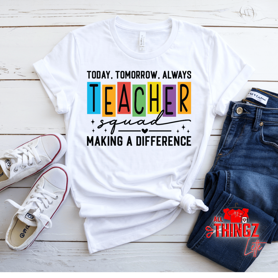 Show your pride for the incredible work educators do with our "Today, Tomorrow, Always Teacher Squad Making A Difference" graphic t-shirt! This vibrant and inspiring design features bold, colorful lettering that stands out, celebrating the dedication and impact of teachers every single day.