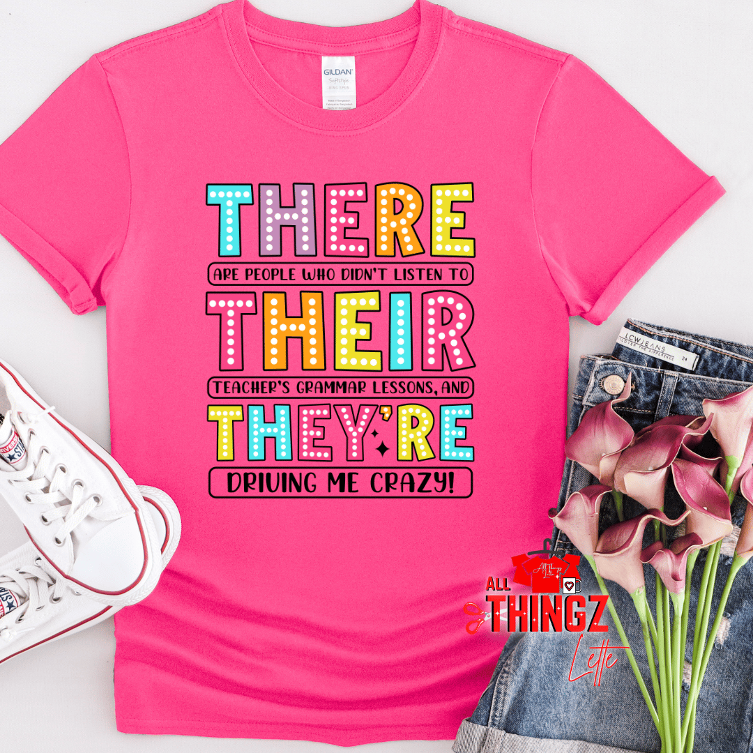 For anyone who's ever cringed at a misused "their," "there," or "they're," this t-shirt is your perfect declaration! Our "THERE are people who didn't listen to THEIR teacher's grammar lessons, and THEY'RE driving me crazy!" graphic tee is a fun and witty way to express your inner grammar guru (or just your pet peeve!).